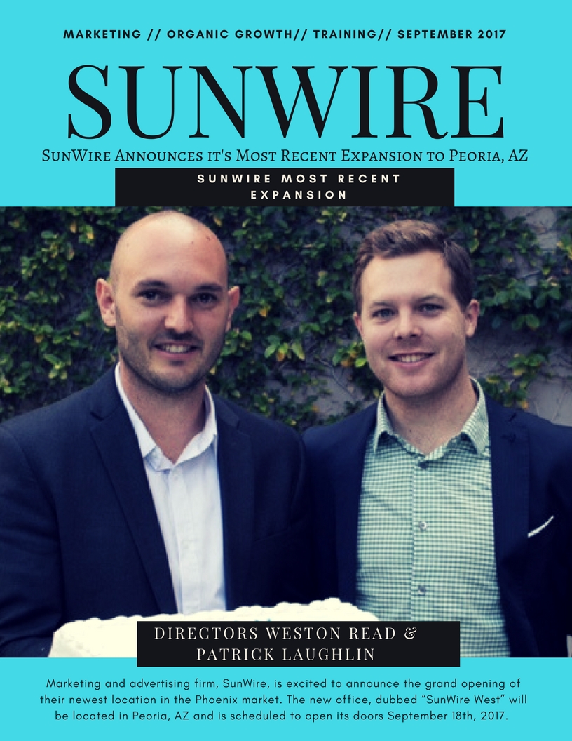 PHOENIX, AZ – Marketing and advertising firm, SunWire, is excited to announce the grand opening of their newest location in the Phoenix market. The new office, dubbed “SunWire West” will be located in Peoria, AZ and is scheduled to open its doors September 18th, 2017.